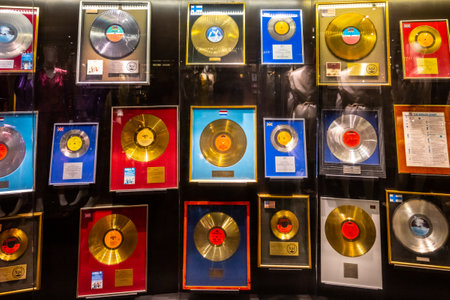 STOCKHOLM, SWEDEN - JUNE 16, 2022: hall with a collection of records at the ABBA museum in Stockholm, Sweden
