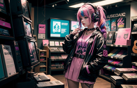 Pretty girl with colorful hair in black leather clothes and headphones standing in a gaming shop.