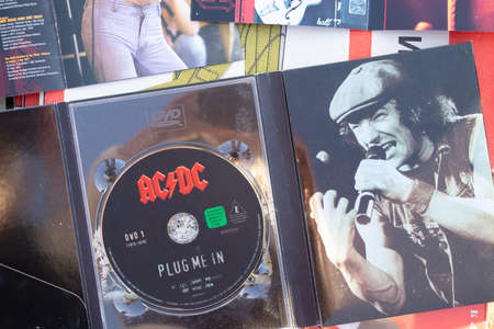 Ukraine Dnepr 18.02.2022 - AC dc music disc in the store for sale, rock musician in the music collection