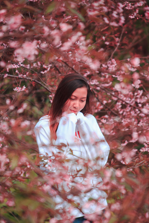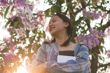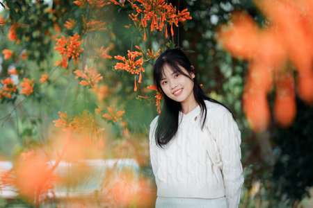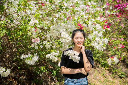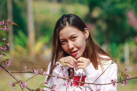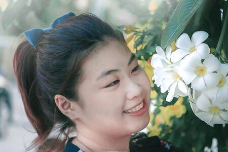 Portrait Young Asian girl outdoor, beautiful flower background.