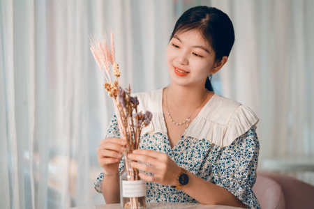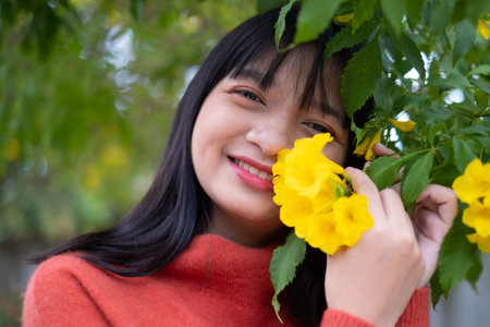Asian woman with yellow flower and green leaves or leaf blurred background for lifestyle portrait people image