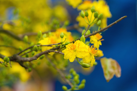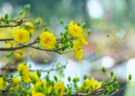 Apricot flowers blooming in Vietnam Lunar New Year with fragrant yellow petals blooming spring has come signaling, this is the symbolic flower for good luck in the New Year's Day