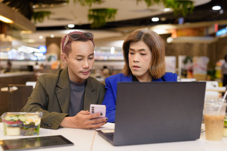 Asian transgender woman and non-binary coworkers working remotely in cafe