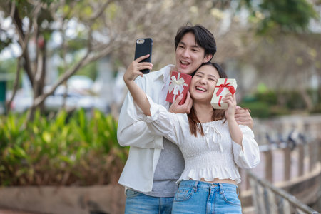 An Asian couple shares a joyful moment while exchanging gift boxes in a scenic outdoor setting. The scene captures feelings of love, celebration, and connection during a special occasion.