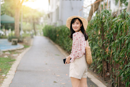 Portrait of young asian woman traveler with weaving hat and basket happy smile on green public park nature background. Journey trip lifestyle, world travel explorer or Asia summer tourism concept.
