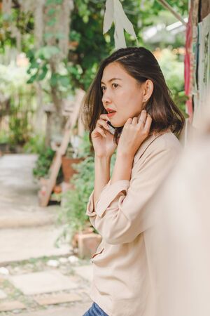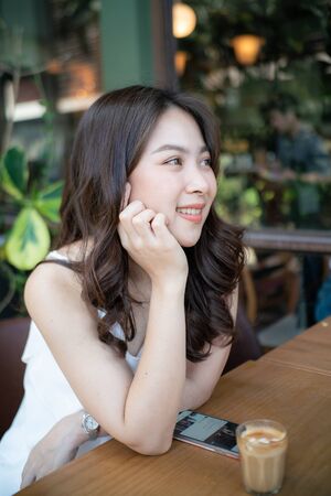 Asian pretty girl has relaxing with happy and smiling at Little Tree Garden cafe, Nakhon Pathom province, Thailand in the morning.