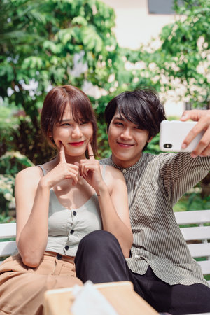 Portrait of a lovely asian couple having good time and taking a selfie with mobile phone in coffee shop.
