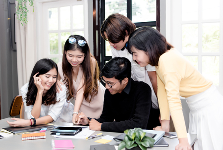 group of young asian student discussing about interesting things in laptop at coworking space.
