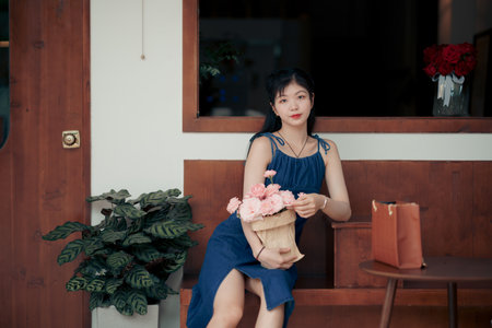 Beautiful Asian Chinese looking lady sitting in a wooden cafe restaurant.