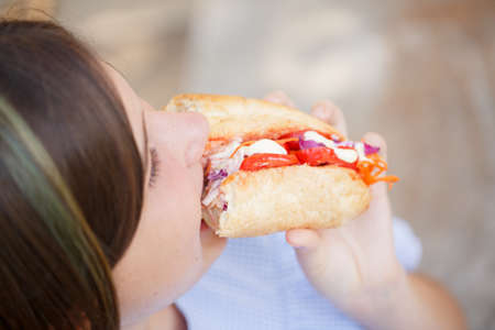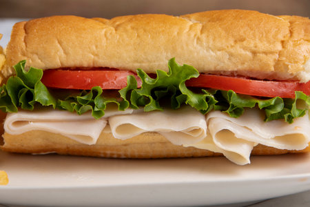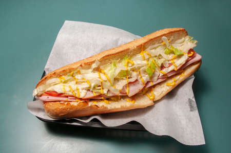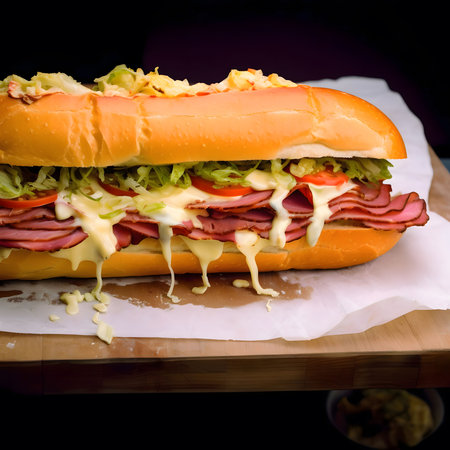 Delicious sub sandwich with layers of meat, mayonnaise, and lettuce enjoyed during lunchtime
