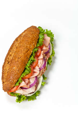Sub sandwich with fresh vegetables, lunch meat and cheese on hoagie roll.