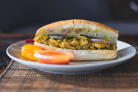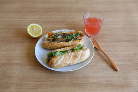 Bain Mee. A sandwich made of French bread with a variety of ingredients, including liver paste, ham, pickled vegetables, and herb.
