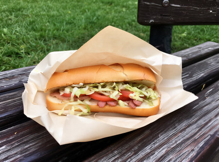 Freshly made hot dog with cabbage and tomatoes on a park bench. That the image is generated using AI.