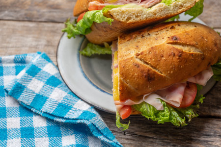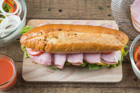 Ham and cheese sub sandwich with artisan bread on wooden background