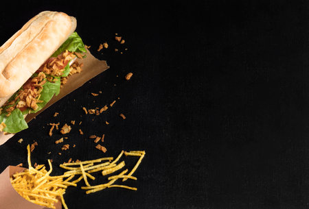 Delicious superior view chips inside the plate in the dark background potato sandw, generative AI