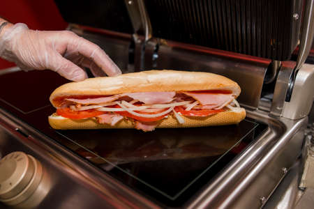 Sandwich in the making. Fresh buns with sauces, onion, beef, cheese and letucce. Food preparing from food track concept.