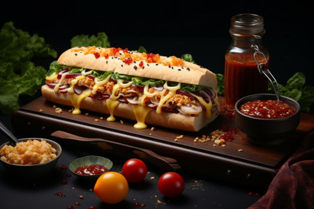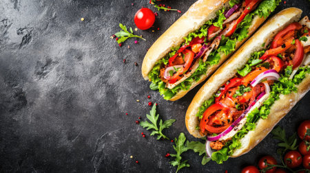 Delicious grilled chicken sub sandwich served with fresh vegetables on a dark rustic background