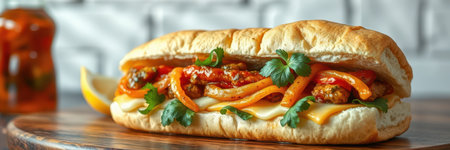 Delicious sandwich filled with spicy meat, peppers, and fresh herbs served on a wooden board