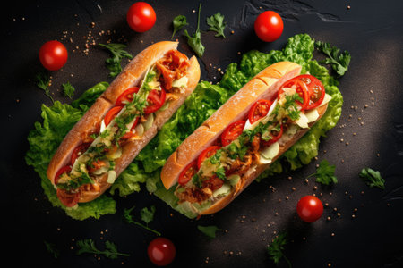 Submarine sandwiches with ham, cheese, tomatoes, cabbage and cucumber. Fresh delicious dish