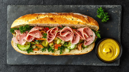 Delicious ham and vegetable sandwich on white bread, served on a slate platter with a side of mustard, top view