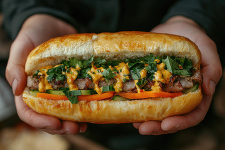 Chef presenting a freshly made banh mi sandwich filled with grilled pork, cilantro, cucumber, tomato, and a flavorful sauce