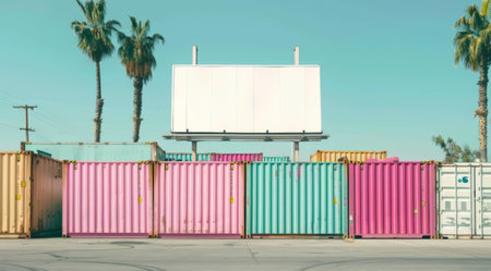 Cargo container with blank billboard on blue sky background. Mockup for advertising banners or design.