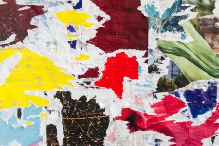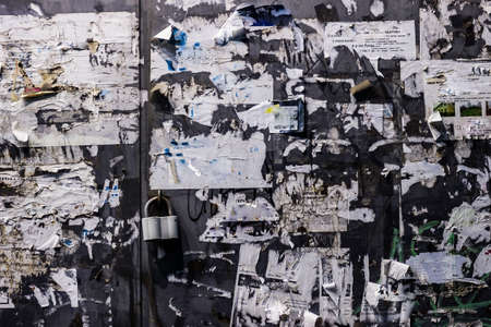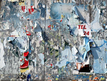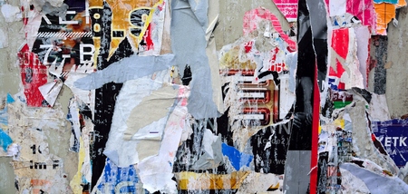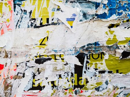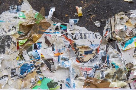 Collage of old ripped magazine paper. Grungy street billboard with motley torn and peeling placards texture background.