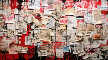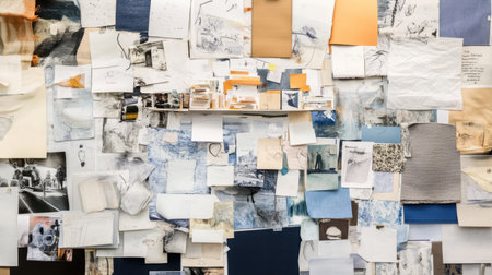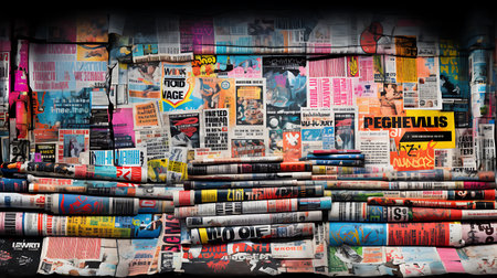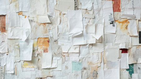 A wall covered in lots of different types of papers. AI generative image. Abstract collage.