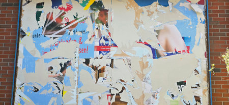Artistic Urban Street Background with Grungy Wall with Ripped, Torn And Peeled Posters. Old Wall with Scratched Advertising. Old Billboard with Torn Posters. Vintage Wide Background and Texture.