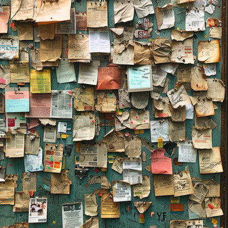 Close-Up Photograph of a Busy Wall Covered in Papers, Flyers, and Notices