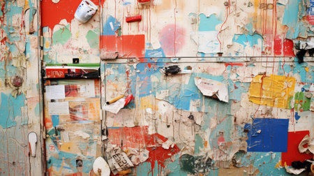 Colorful Abstract Urban Art with Torn Posters and Graffiti Layers on Wall