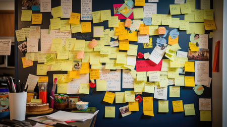A vibrant display of sticky notes lines the wall of a creative workspace, reflecting diverse ideas and thoughts. Each note contributes to a collaborative environment.