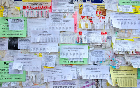 Yeysk, Russian Federation - June, 2014: Paper ads are pasted on the wall. Rent, sale of housing.