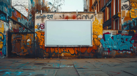 An empty billboard stands out as a blank canvas surrounded by the colorful chaos of street graffiti on urban walls, showcasing a contrast of order and creativity.