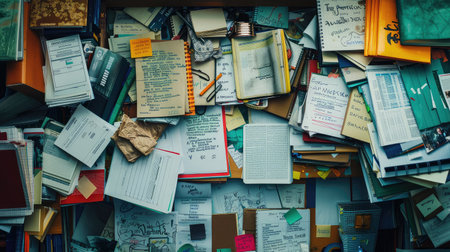 An abstract background featuring a pile of handwritten essays, their pages filled with ideas and arguments