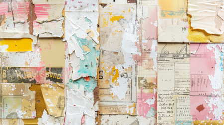 A nostalgic background featuring scraps of old, faded, and battered ads, clippings from tattered posters, and torn advertising posters pasted on a billboard, creating a vintage and rustic texture.