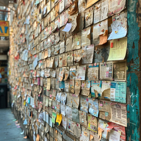 Close-Up Photograph of a Busy Wall Covered in Papers, Flyers, and Notices