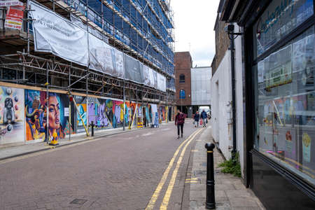 Kingston Upon Thames London UK, May 07 2021, Inner City Construction Site Development Surrounded By Scaffolding With Saferty Netting And Painted Security Fencing