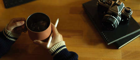 Overhead shot of female freelancer holding coffee mug while sitting at workspace with diary notebooks and camera