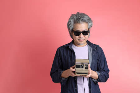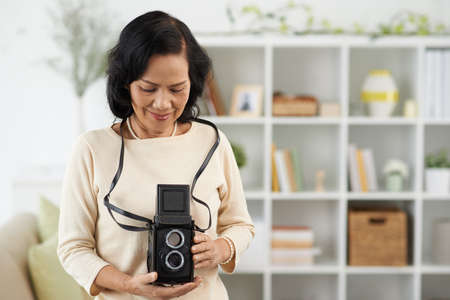 Senior Asian woman looking at the retro camera in her hands