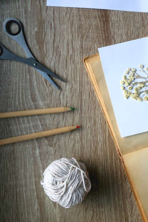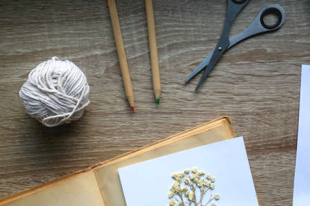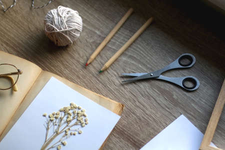 Old book, papers, various pressed flowers, eyeglasses, scissors, pencils and rope on wooden desk. Crafting and making herbarium at home. Flat lay.