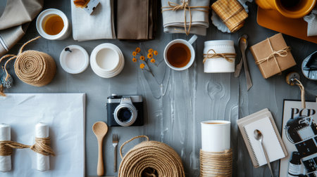 Top view of a creative workspace with various items including a camera, notepad, and craft materials, creating an artistic and organized scene.