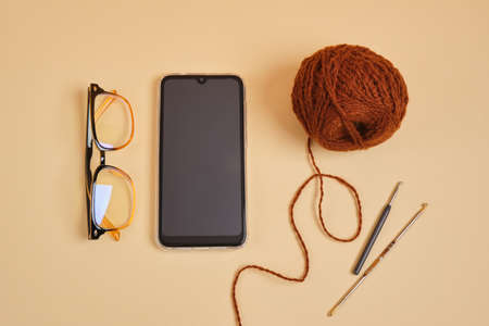 smartphone, glasses and crochet hooks and threads in a basket on a beige background, online knitting training, blogging on needlework