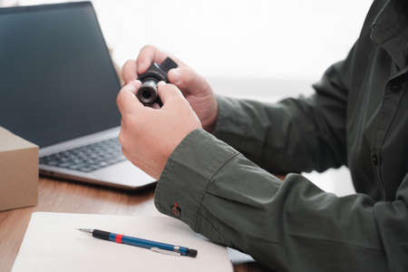 Car service staff hold broken engine coil of gasoline engine and use laptop check part in stock for car service in office