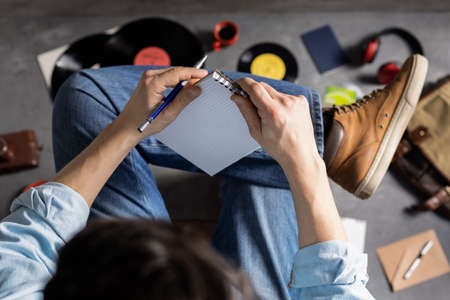 Male hand holding pen or pencil and notebook. Student or composer and art music life style concept