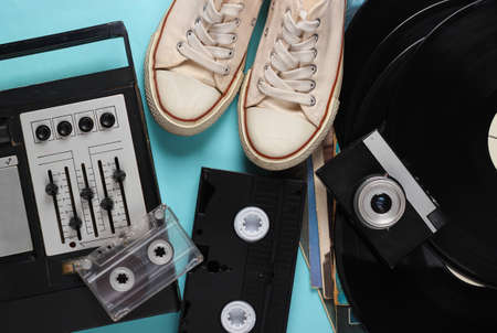 Flat lay retro media composition. Audio recorder, vinyl records, camera, sneakers, video and audio cassette on blue background. Top view