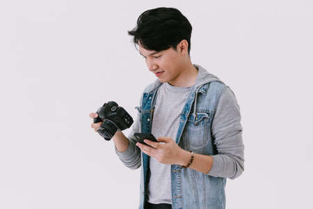photographer with camera hobby technology studio lifestyle creative light background