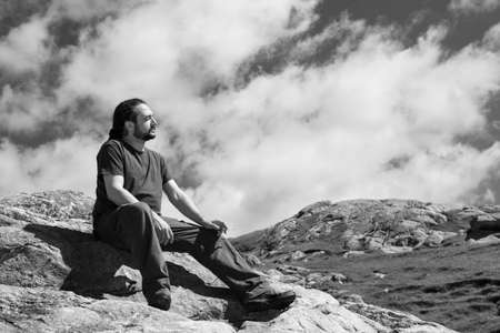 Young handsome caucassian male with dreadlocks enjoying the view on a sunny day trekking in the mounains