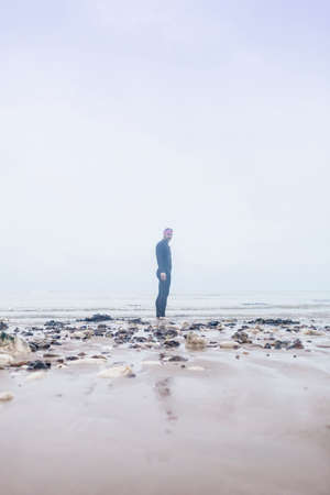 A male athlete with arms outstretched to the side is standing on the seashore. View from the back. Joy of victory. Trail Running. Mangystau Peninsula