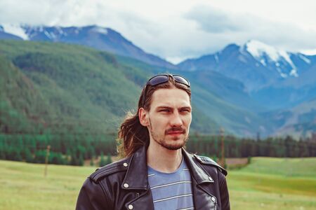 the guy stands against the background of snowy mountains with snow-capped peaks